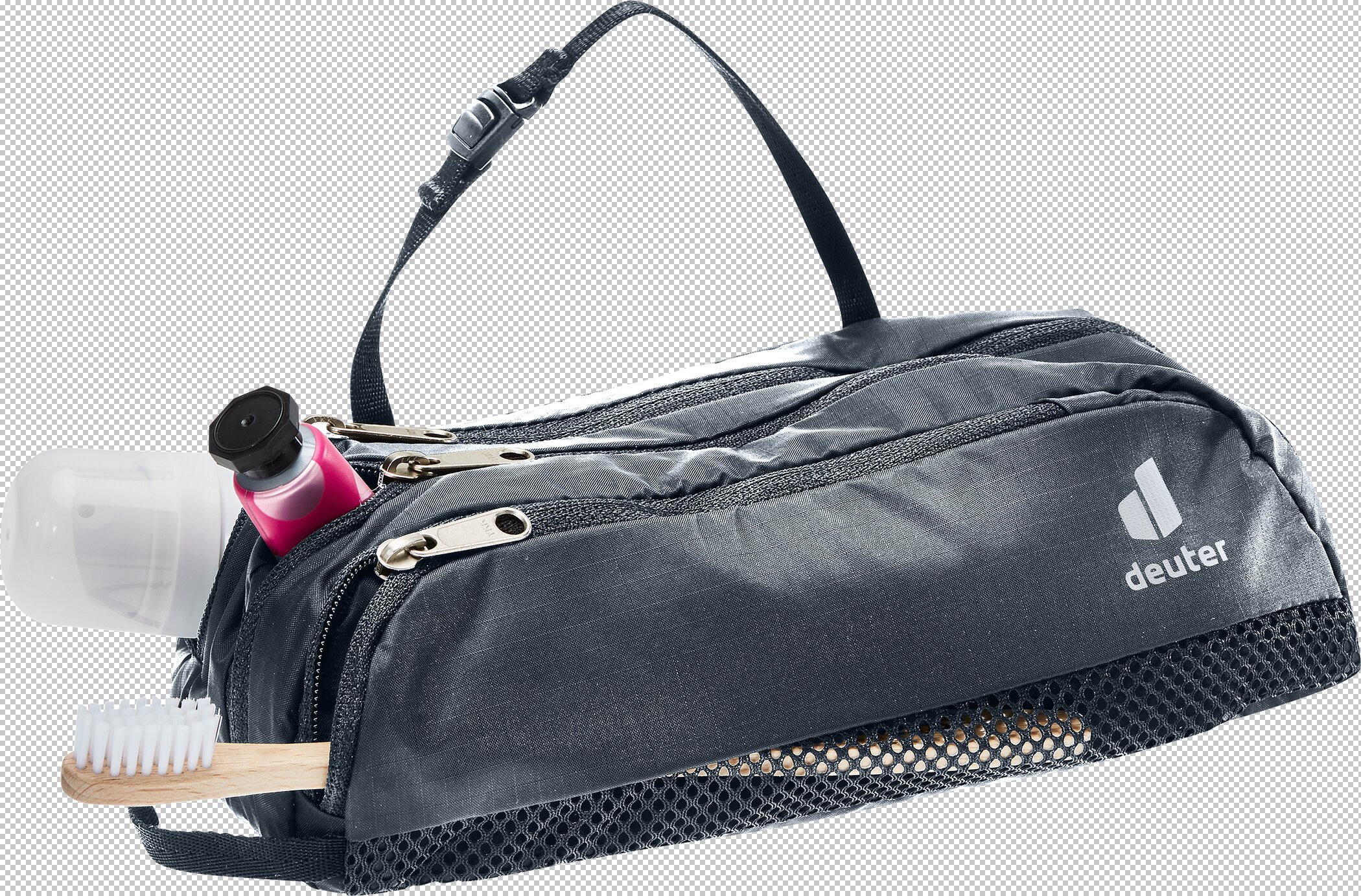 Leichtgewicht; eine RV-Netzaußentasche für Zahnbürste; zwei RV-Fächer; RV-Hauptfach mit zusätzlichem Netzinnenfach; Befestigungsschlaufe mit Clip