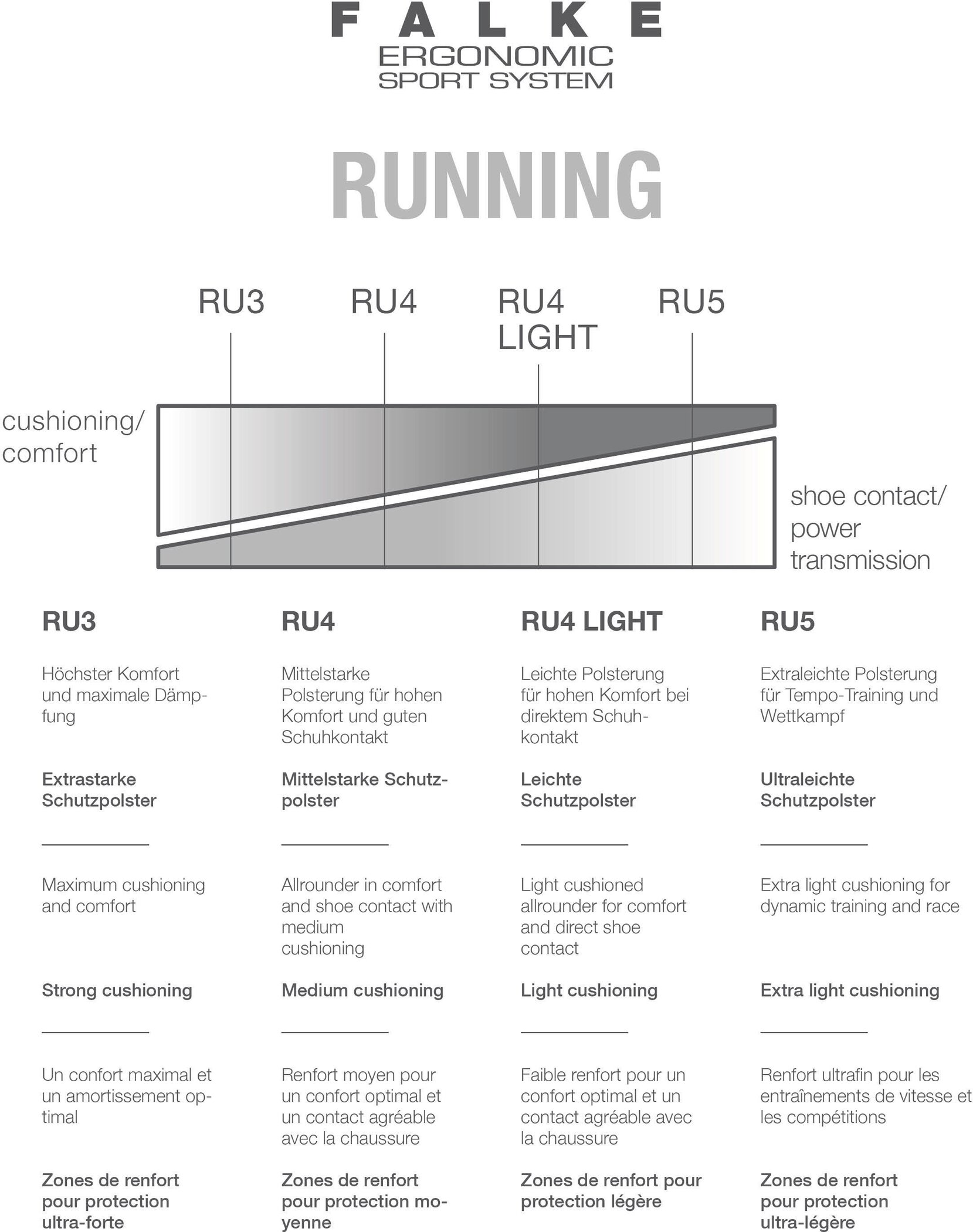 Mit ihrer mittelstarken Polsterung ist die Laufsocke „RU4“ unsere Allrounder-Socke für Damen. Sie sorgt für ausgewogenen Schutz bei mittlerer Dämpfung sowie guten Schuhkontakt. Die Polsterung bietet außerdem Schutz vor Blasen durch Reduzierung der Druckstellen. Schneller Feuchtigkeitstransport sowie die optimale Passform garantieren angenehme und sportliche Jogging-Einheiten.